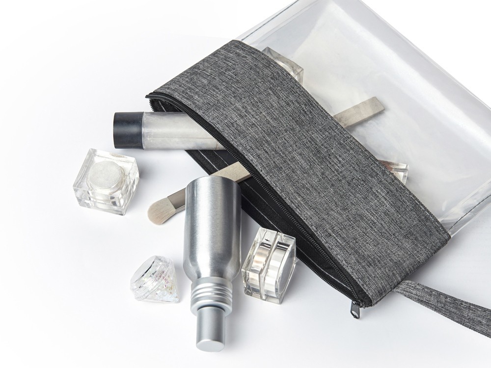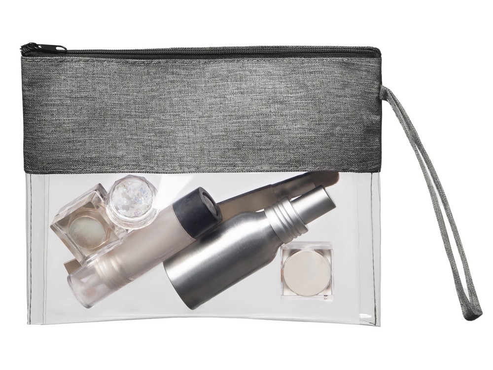 Купить Косметичка из PVC и ткани "Leony", прозрачный/темно-серый, с нанесением логотипа компании, индивидуального изображения или гравировкой, Вы можете в магазине корпоративных подарков и бизнес сувениров DIMLE.Более подробную информацию можно уточнить у менеджера по телефону: +7 (977) 760-71-47
