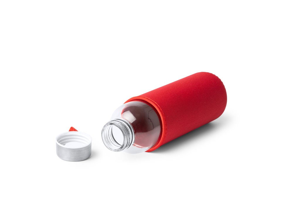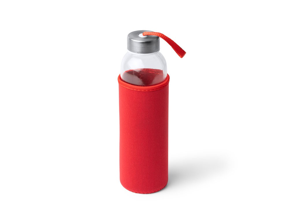Купить Бутылка стеклянная CAMU в чехле из неопрена, 500 мл, прозрачный/красный, с нанесением логотипа компании, индивидуального изображения или гравировкой, Вы можете в магазине корпоративных подарков и бизнес сувениров DIMLE.Более подробную информацию можно уточнить у менеджера по телефону: +7 (977) 760-71-47