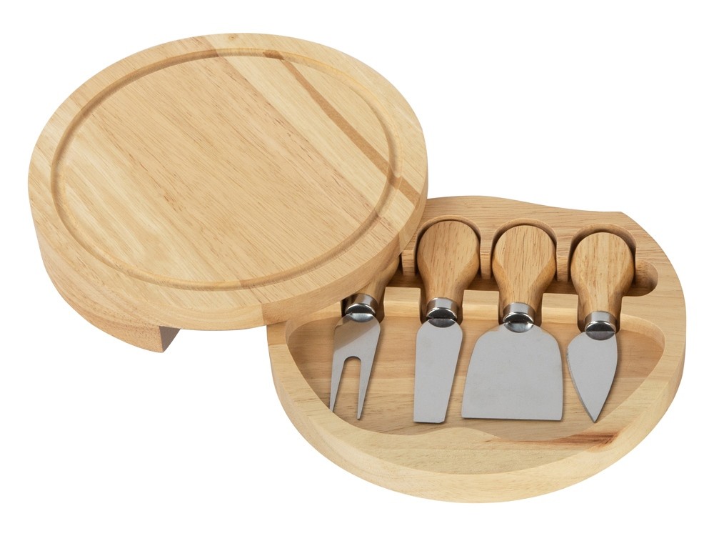 Подарочный набор для сыра в деревянной упаковке включает в себя три вида ножей и одну вилку. С помощью приборов можно нарезать сыры разных сортов. Набор упакован в деревянную подарочную коробку, которую можно использовать для хранения этих инструментов. Удобный поворотный механизм позволяет использовать крышку в качестве разделочной доски. Специальные выемки в коробке фиксируют приборы в безопасном положении. Набор включает в себя: - листовидный нож для твердых сортов сыра, - нож-лопатка для мягких сортов сыра, - вилка для сыра, - нож для твердых сортов сыра, - разделочная доска с поворотным механизмом.
