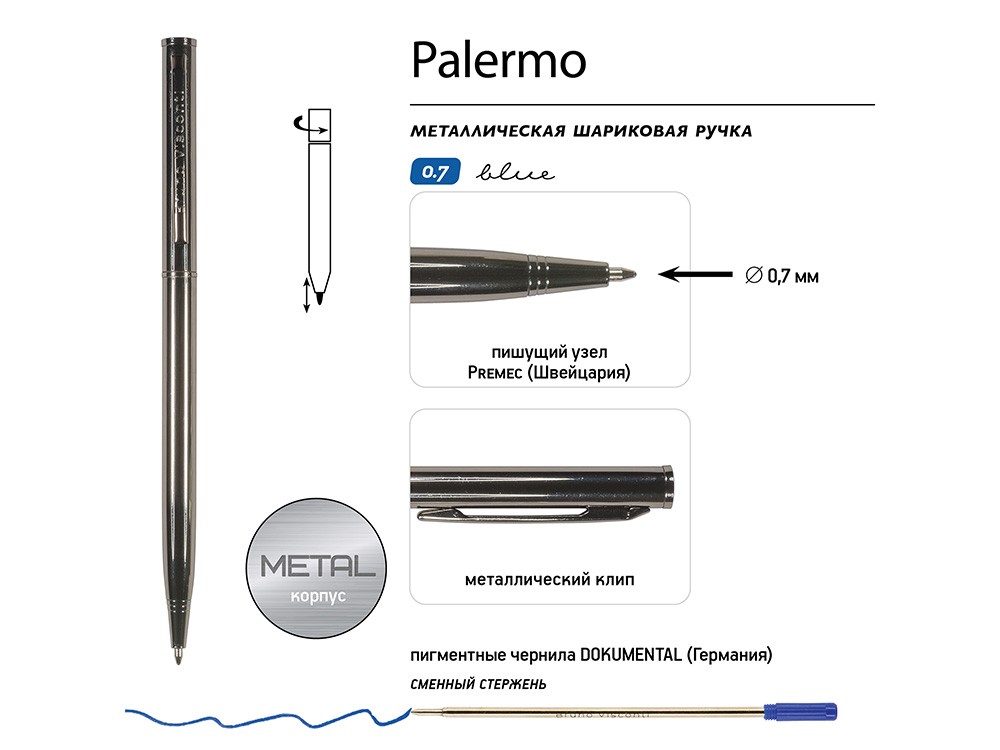 Купить Ручка шариковая автоматическая BrunoVisconti® "PALERMO" цвет корпуса вороненая сталь, 0.7 мм, с нанесением логотипа компании, индивидуального изображения или гравировкой, Вы можете в магазине корпоративных подарков и бизнес сувениров DIMLE.Более подробную информацию можно уточнить у менеджера по телефону: +7 (977) 760-71-47