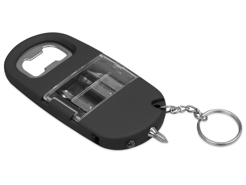 Купить Брелок-открывалка с отвертками и фонариком "Uni", софт-тач, черный (Р), с нанесением логотипа компании, индивидуального изображения или гравировкой, Вы можете в магазине корпоративных подарков и бизнес сувениров DIMLE.Более подробную информацию можно уточнить у менеджера по телефону: +7 (977) 760-71-47