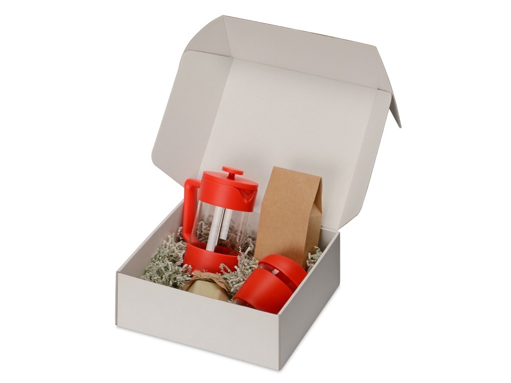 Купить Подарочный набор с кофе, кружкой и френч-прессом "Бодрое утро", красный, с нанесением логотипа компании, индивидуального изображения или гравировкой, Вы можете в магазине корпоративных подарков и бизнес сувениров DIMLE.Более подробную информацию можно уточнить у менеджера по телефону: +7 (977) 760-71-47