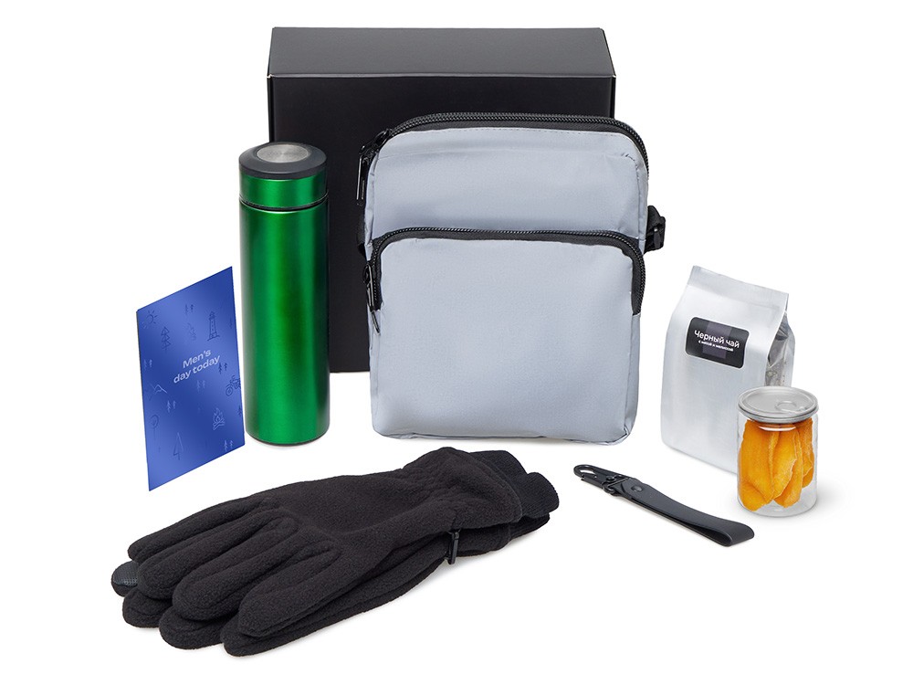 перчатки - полиэстер, термос - нержавеющая сталь, чай - пластик, брелок-ремувка - искусственная кожа, металл, манго - пластик, светоотражающая сумка - хлопок, полиэстер,мешок - нетканый материал (спанбонд), коробка - картон
