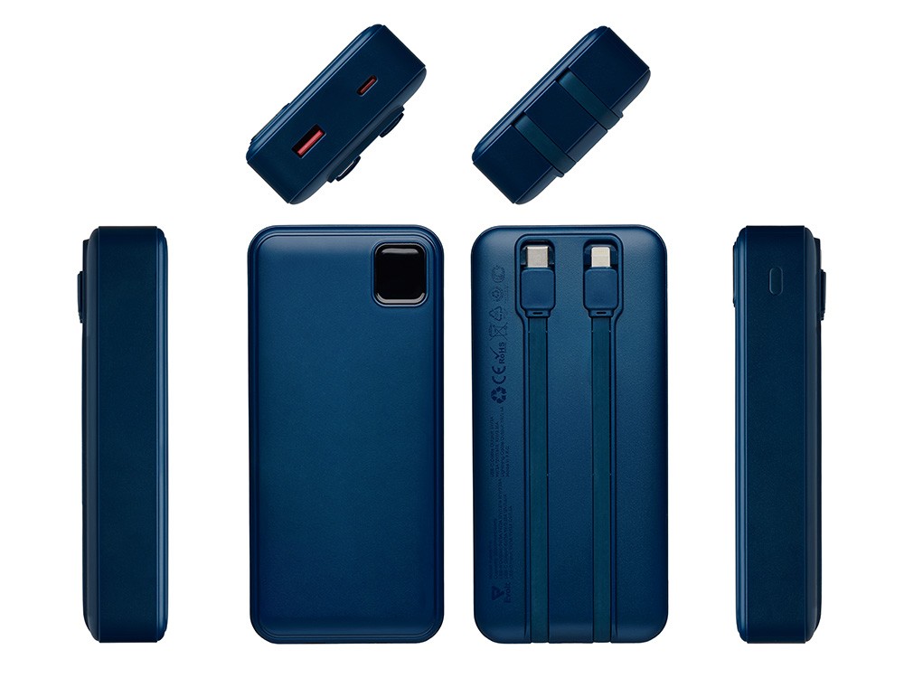 Купить Внешний аккумулятор со встроенными кабелями «Фрэйм Про», быстрая зарядка, 20000мач, тёмно-синий, с нанесением логотипа компании, индивидуального изображения или гравировкой, Вы можете в магазине корпоративных подарков и бизнес сувениров DIMLE.Более подробную информацию можно уточнить у менеджера по телефону: +7 (977) 760-71-47