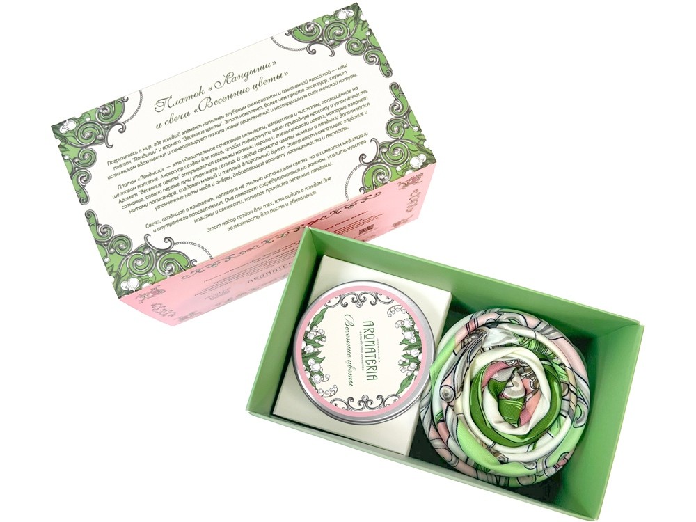 Купить Набор: платок «Ландыши» и свеча «Весенние цветы», с нанесением логотипа компании, индивидуального изображения или гравировкой, Вы можете в магазине корпоративных подарков и бизнес сувениров DIMLE.Более подробную информацию можно уточнить у менеджера по телефону: +7 (977) 760-71-47