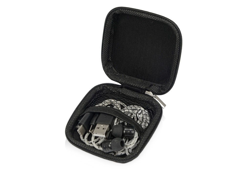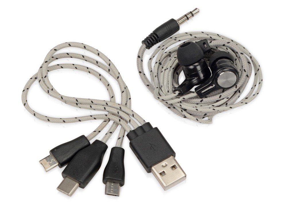 Купить Набор с наушниками и зарядным кабелем 3-в-1 "In motion", серый, с нанесением логотипа компании, индивидуального изображения или гравировкой, Вы можете в магазине корпоративных подарков и бизнес сувениров DIMLE.Более подробную информацию можно уточнить у менеджера по телефону: +7 (977) 760-71-47