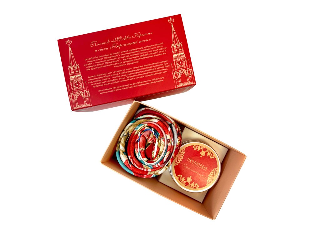 Купить Набор: платок «Кремль – Москва» и свеча «Бархатный пион», с нанесением логотипа компании, индивидуального изображения или гравировкой, Вы можете в магазине корпоративных подарков и бизнес сувениров DIMLE.Более подробную информацию можно уточнить у менеджера по телефону: +7 (977) 760-71-47