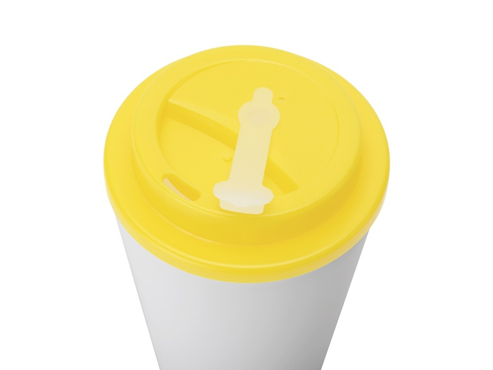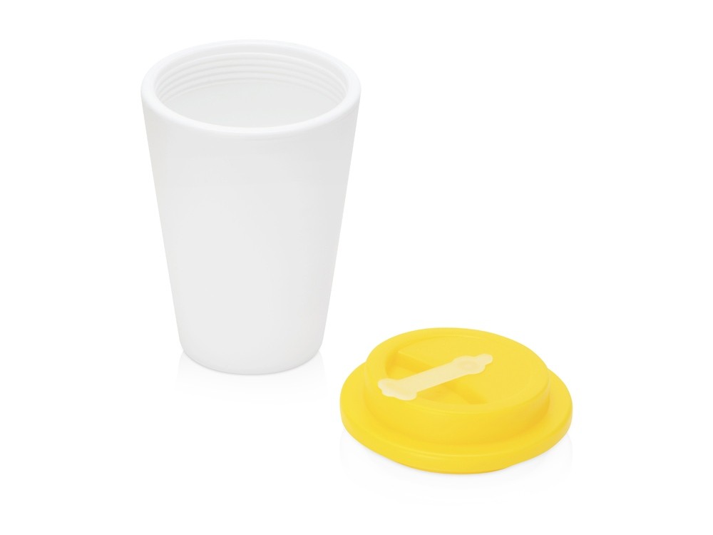 Купить Пластиковый стакан Take away с двойными стенками и крышкой с силиконовым клапаном, 350 мл, белый/желтый, с нанесением логотипа компании, индивидуального изображения или гравировкой, Вы можете в магазине корпоративных подарков и бизнес сувениров DIMLE.Более подробную информацию можно уточнить у менеджера по телефону: +7 (977) 760-71-47